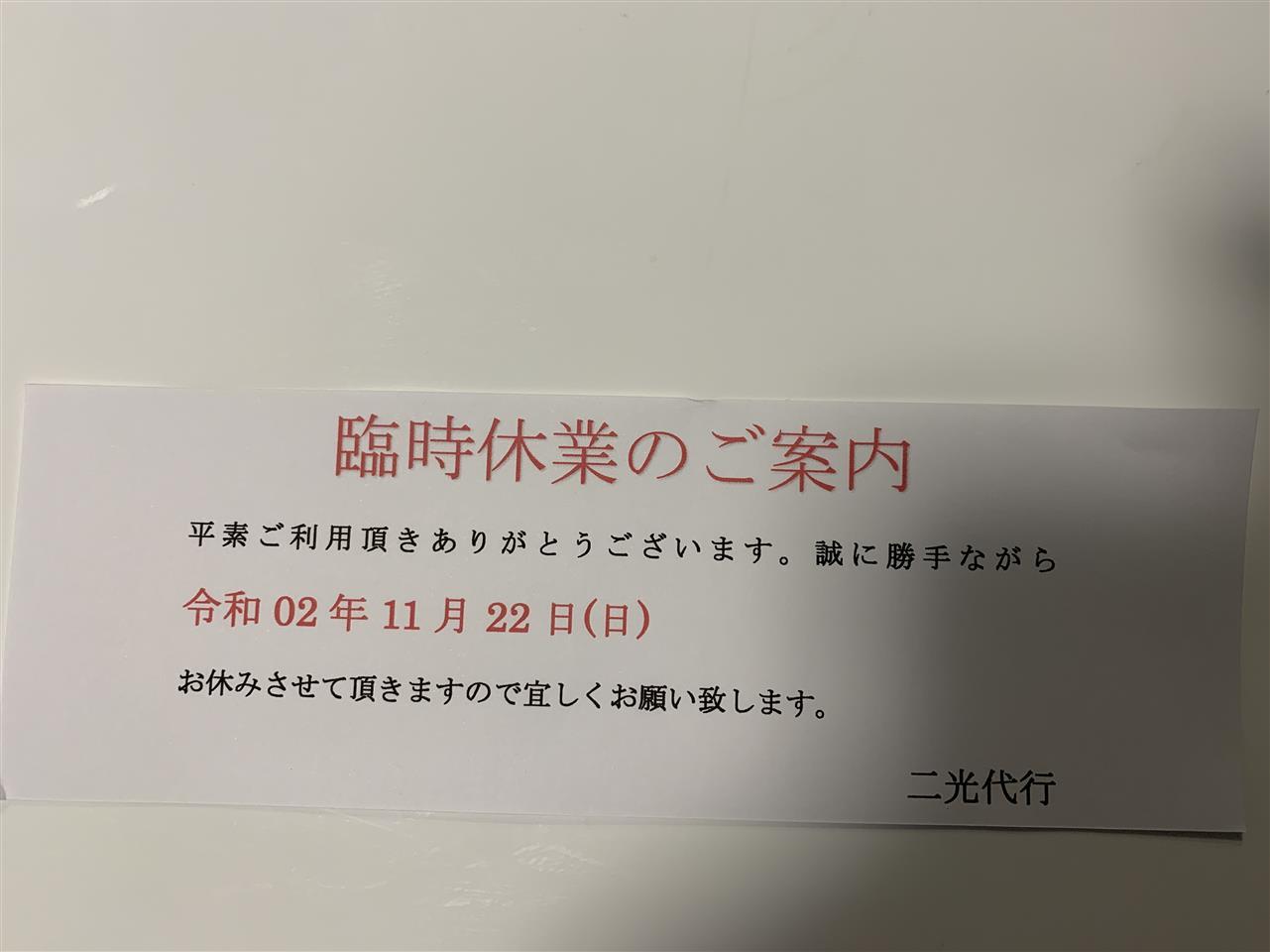 いつも二光代行をご利用頂きありがとうございます。誠に勝手ながら、11月22日臨時休業とさせていただきます。